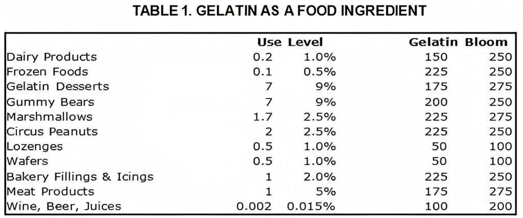 Commercial gelatin varies from 50-300 Bloom grams and, except for specialty items, is free of added colors, flavors, preservatives, and chemical additives. Gelatin is generally recognized as a safe (GRAS) food ingredient. Table 1 lists several food categories that utilize gelatin, and recommended levels and Blooms.