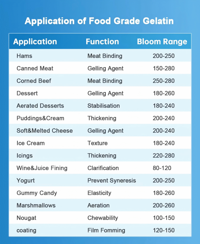 Commercial gelatin varies from 50-300 Bloom grams and, except for specialty items, is free of added colors, flavors, preservatives, and chemical additives. Gelatin is generally recognized as a safe (GRAS) food ingredient. Table 1 lists several food categories that utilize gelatin, and recommended levels and Blooms.