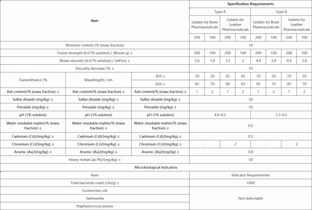 Pharmaceutical gelatin is an important fine chemical raw material with a wide range of applications. As a pharmaceutical gelatin, its quality directly affects public health and must be strictly controlled. Gelatin quality is mainly assessed from three aspects: its physical properties, chemical properties, and microbial limits. The current relevant standard for pharmaceutical gelatin in China is QB2354-2005, the Light Industry Standard for Pharmaceutical Gelatin.